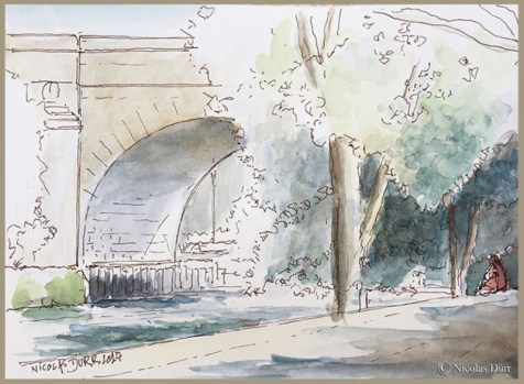 Voici un passage arboré du quai de la rive gauche de la Loire, à Tours, avec la dernière arche du Pont Wilson en arrière-plan. Cette rive, situé au Nord du centre ville de Tours, est moins sauvage que la rive droite. Ici, les quais ont été aménagés pour protéger la ville des crues.