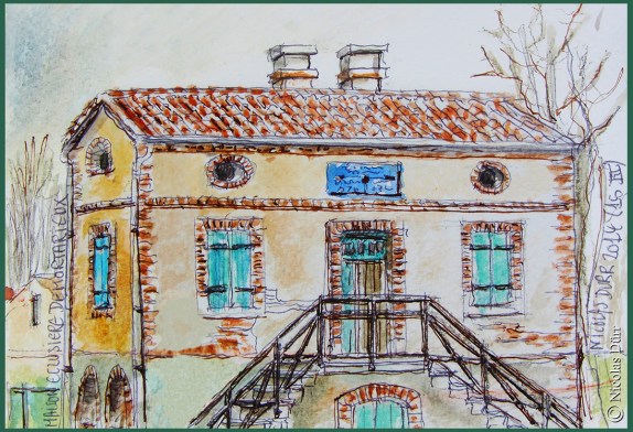 C’est par cette aquarelle ci dessous que s’achève ce court article. Il est à noter qu’un « code couleur », plus ou moins respecté se retrouve sur les bâtiments des canaux des Deux-Mers (dont fait partie le Canal de Montech) comme celui des portes et des volets.