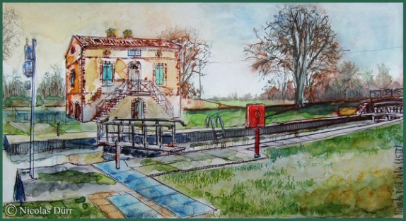Con esta acuarela, aquí abajo, se cierra este corto artículo. Es preciso apuntar que una paleta de colores más o menos respetada se percata a lo largo de los edificios de los canales des Deux-Mers (de los Dos Mares) cuyo Canal de Montech forma parte.
