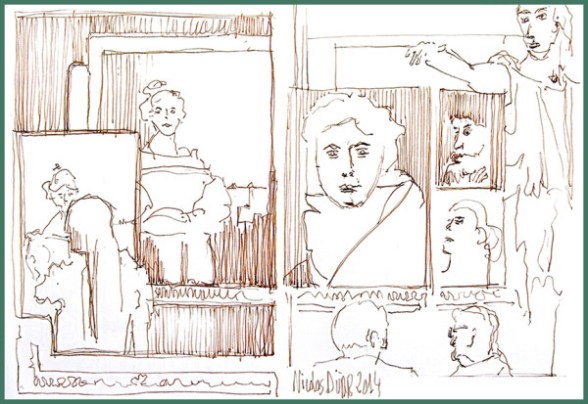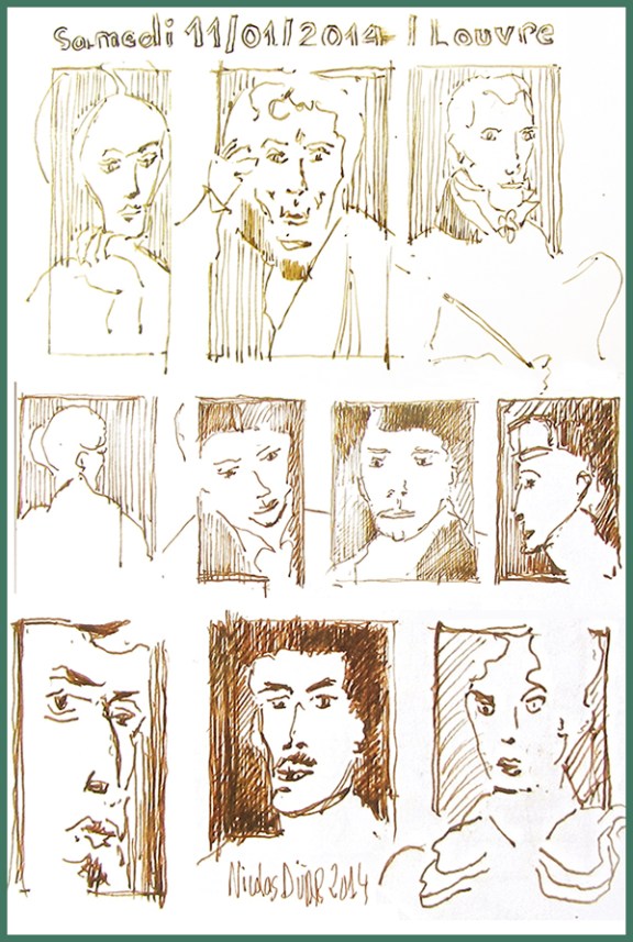 Le thème du jour consistait à dessiner des portraits d’après tableaux tout en se fixant des règles de composition, comme la délimitation par cadrages. J’ai donc commencé par plusieurs visages les uns à côté des autres avant de chercher un emboitement plus harmonieux, comme l’idée du « cadre dans le cadre », en n’hésitant pas à intégrer une copiste en plein travail.