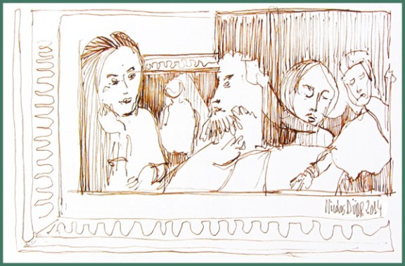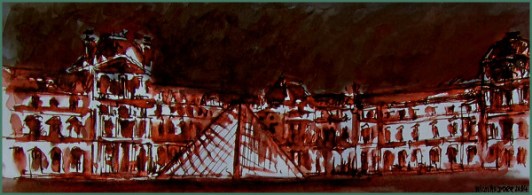 En ce samedi 11 janvier 2014, rendez vous était pris sous la pyramide, point de repère quasiment indispensable pour se rendre dans toutes les salles du musée, et l’occasion de croquer sur le vif cet endroit, comme vous pouvez le découvrir sur le dessin à l’encre dilué et à la plume ci dessous.