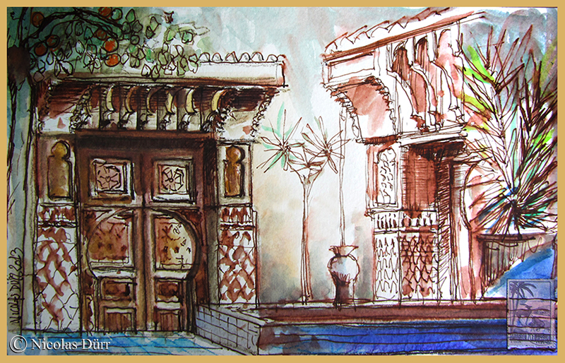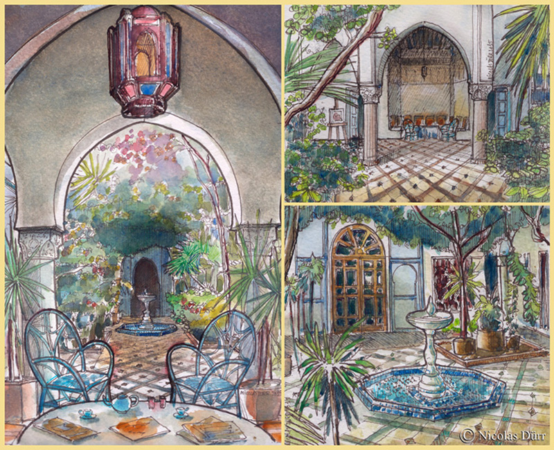 J’ai le plaisir de vous présenter en images (aquarelles, dessins, pastel gras et photos) la maison d’hôtes dans laquelle nous avons séjourné, d’une décoration digne des « Milles et Une Nuits », dotée d’un rafraîchissant patio arboré, sans oublier la cuisine exceptionnelle qui nous a été servie.
