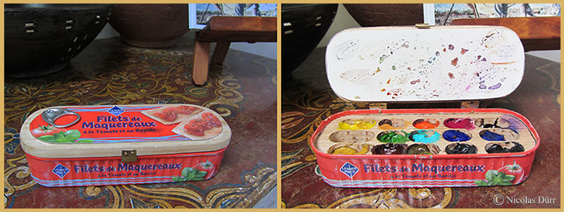 Accompagné de son mari, Dan, un bricoleur hors-pair, qui serait capable de construire un palais avec 3 branchages et 4 planches, (j’exagère à peine), voici la boite d’aquarelle qu’il a confectionnée, à partir d’une boite de sardines.