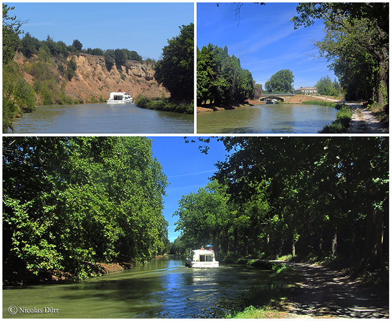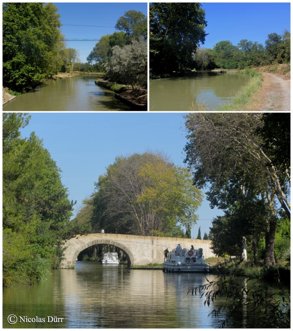 Sans plus tarder, en cet après midi de mon 4ème jour de randonnée à bicyclette, après m’être restauré à Trèbes et à l’heure de la sieste, je découvre le cours d’eau traversant le rocher de Marseillette (photo en haut à gauche), au relief accidenté qui me laisse deviner aisément la difficulté rencontrée lors du percement du Canal du Midi à cet endroit.