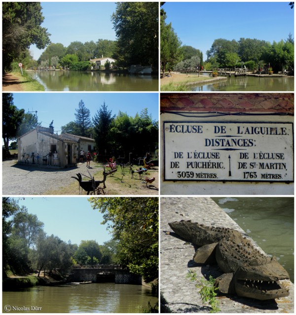 Voici l’écluse de l’Aiguille, datant de 1679, à 133 km 707 de la Garonne, a bassin doubles , à 59 m au dessus du niveau de la mer. Joël Barthes, en poste depuis 1978, n’est pas seulement éclusier, mais aussi un artiste, sculpteur en particulier. A partir de matériaux de récupération, du bois et du fer essentiellement, drainés par le canal ou trouvé au bord du chemin, cet ancien routier façonne des créations dignes de son imagination, en puisant dans le bestiaire, comme en témoigne ce crocodile ma fois fort inoffensif, ou en prenant comme référence un chanteur comme Brassens. Affinant son savoir faire au fil des années, certaines de ses sculptures sont animées. Cet artiste bohème à la main verte, puisque les fleurs et plantes ne sont pas oubliées, qui travaille sérieusement sans se prendre au sérieux, n’hésite pas non plus à s’inspirer de l’anatomie humaine.
