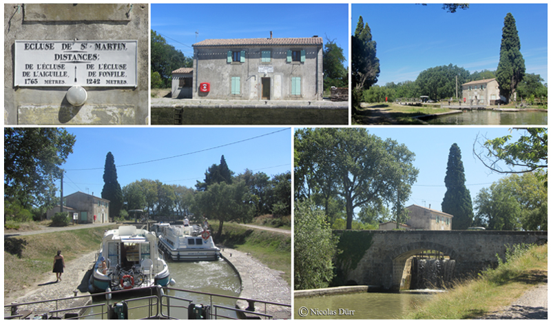 L’écluse de St Martin, datant de 1679, le 47e ouvrage à franchir depuis Toulouse, à bassins doubles, au km 131, 344 depuis la Garonne et à l’altitude de 67 m, se distingue par ses bassins de 30 m de long pour 5 m 35 sur ses plus grandes largeurs, autrement dit, les plus petits du Canal du Midi. J’ose espérer que les façades du bâtiment seront vite ré enduites.