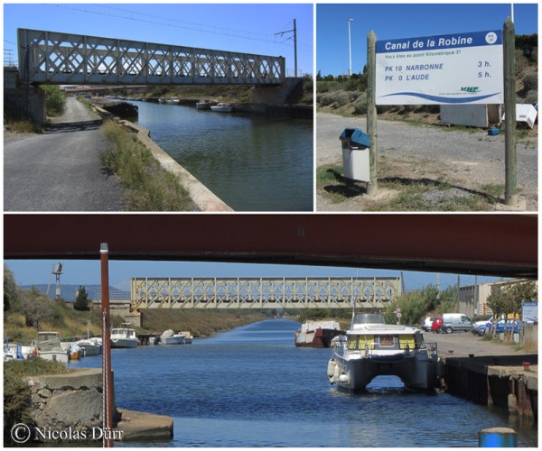 Nous sommes au km 31 du Canal de la Robine, à 3,033 km du phare de port la Nouvelle, à 39,474 km de l’embranchement sur le Canal du Midi, à 208 km du point de rencontre de ce dernier avec la Garonne et à 112,500 km du phare des Onglous en longeant les canaux.