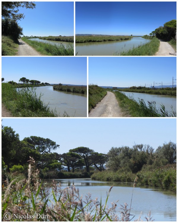 Le canal et le chemin de fer se frayent un passage entre toutes ces étendues d’eau et des pins parasols viennent ponctuer de longues sections sans arbres. Il est donc préférable, en plein soleil au mois d’août, surtout sur ce long bief isolé, notamment sur la rive gauche, de marcher ou pédaler avant 12 heures ou après 16 heures. A ma connaissance, aucune possibilité de se ravitailler en eau potable avant l’arrivée sur l’écluse Sainte Lucie, du moins sur la rive gauche.