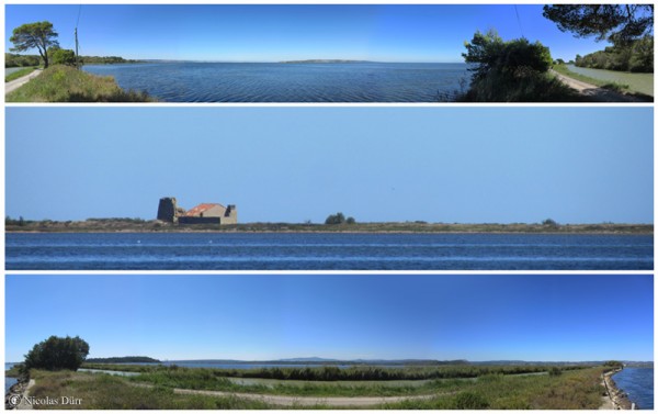 Le peu de passage, une forte chaleur, et la vue de ces étendues d’eau à perte de vue m’ont donné l’envie de me baigner ne serait ce que 10 minutes dans l’étang de l’Ayrolle. Le fait que ce soit très certainement interdit, d’une part, le fait que je sois seul, sans avoir emporté avec moi ni serviette ni maillot de bain, d’autre part, renforcé par l’idée que le rapport au corps de nos pays latin diffère de celui des pays nordiquesvis à vis de la nudité, et n’ayant peut être plus ni la spontanéité ni l’audace que j’aurais certainement pu avoir quand j’étais plus jeune, m’ont fait renoncer à cette idée. Je me suis donc contenté d’admirer ces panoramiques au cours d’une halte sous un pin parasol et que je vous fais découvrir à travers les photos ci dessous.