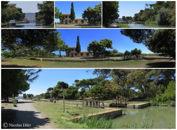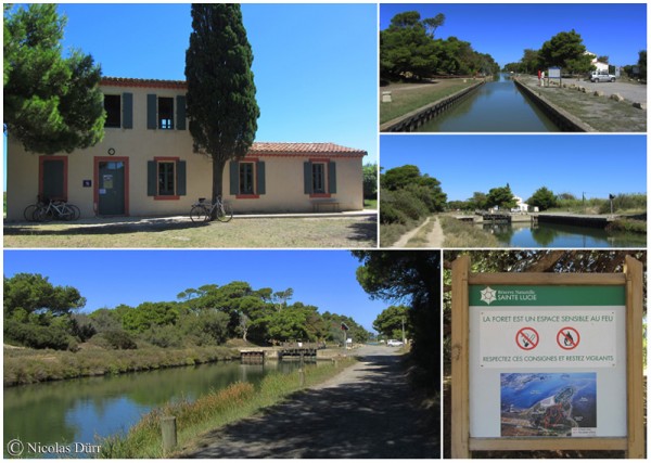 Me voici rendu à la cinquième et dernière écluse du Canal de la Robine, Sainte Lucie, à bassin simple lieu arboré, propice au repos, à la détente, aux piques-nique, à la pêche… ou au farniente, avec un bâtiment très bien restauré.