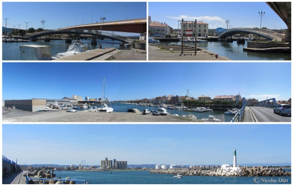 Ci dessous, différentes vues depuis l’arrivée du Canal de la Robine et depuis le phare. Sur la photo du bas, les silos à céréales construits dans les années soixante.