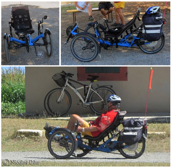 Des rencontres insolites sont possibles, tant sur les personnes que sur leur « attirail » comme ce monsieur de 87 ans habitant Leucate et qui s’astreint à pédaler quotidiennement sur un vélo « couché » électrique muni de 2 batteries. Je reste bluffé par la forme physique de cet octogénaire qui fait mentir l’adage comme quoi la vieillesse peut être un naufrage. Ce personnage me fait penser à ce centenaire cycliste, Robert Marchand qui continue à gravir des cols, malgré son grand age.