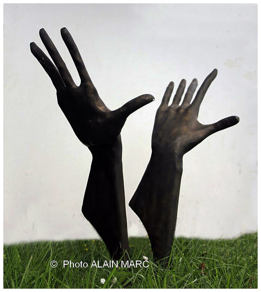 Avant d’envisager l’édification de sa sculpture intitulée « L’Envol », visible à Eragny, dans le Val-d’Oise, Jean Marc, peintre-forgeron-sculpteur et conteur occitan, a préalablement réalisé une maquette visible ci-dessous. Observez la différence entre la travail de préparation et l’oeuvre finale, visible sur les photos précédentes, notammentsur l’ouverture des mains. Comme me faisait remarquer un de mes anciens professeurs, feu Philippe Moutard-Martin, peintre, « il faut toujours dans le rendu final, se réserver une part de création ».