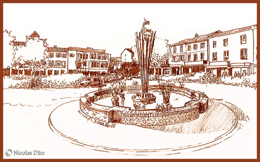 Ci-dessus, un de mes travaux graphiques représentant une sculpture de Jean Marc, peintre-forgeron sculpteur et conteur occitan située sur la Place de la Libération à Gaillac. Elle représente une coupe de mousseux qui fait chanter le terroir. Initialement dorée, le plaquage a disparu avec la patine du temps.