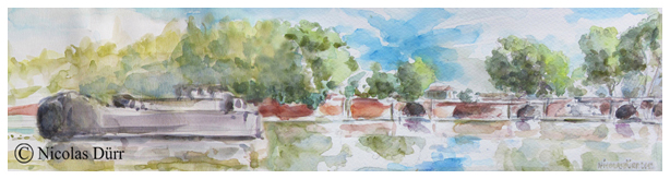 Le pont à gauche, le Canal de Garonne, direction Castets-en-Dorthe (193 km), au centre, le Canal du Midi, direction Marseillan (240 km), et à droite, le Canal de Brienne ou St Pierre, en direction de la Garonne (1 km 500). Entre les Canaux du Midi et de Brienne, le bas relief de Lucas.