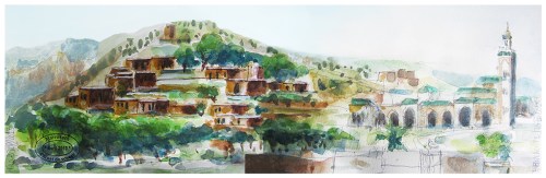 Je choisi de prolonger l’article de Rachid par des aquarelles des environs de Marrakech, que j’ai eu l’occasion de peindre lors d’un séjour proposé par l’aquarelliste Sonia Privat en avril 2013 et qui peuvent se découvrir en quad ou à dos de dromadaire.