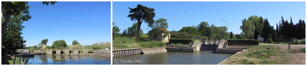 Voici la 63e écluse depuis Toulouse (je compte l’écluse Notre-Dame à Béziers qui n’est plus en service, en données 2022, alors qu’elle n’est pas référencée sur Wikipédia). Nous sommes ici, tout comme le fleuve, à une altitude à 5 m au dessus du niveau de la mer, à 232 km 900 de la Garonne et à 7 km 869 de de l’Etang de Thau et du phare des Onglous.