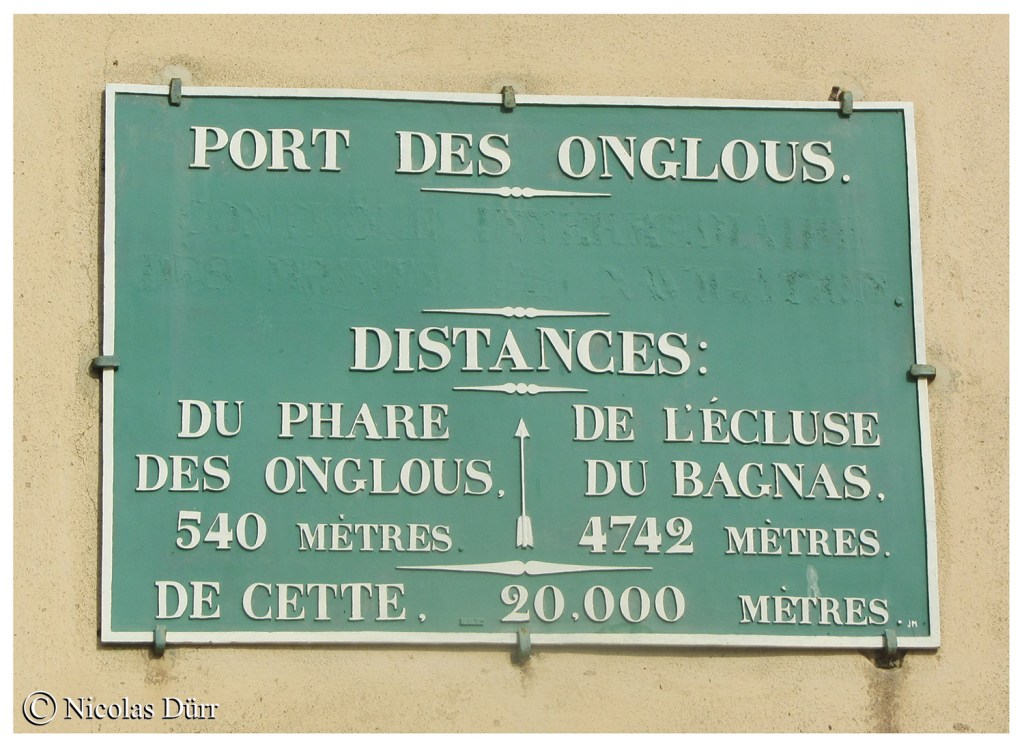 Avant dernier « spot » sur le trajet, le Port des Onglous, qui abrite l’école de voile des Glénans (en données 2022). Sur la plaque, la ville de Sète avec son ancienne orthographe. En 1927, par arrêté ministériel, l’orthographe actuelle est adoptée définitivement, l’ancienne étant jugée équivoque. Cependant, sous l’Ancien régime, on écrivait indifféremment Sette, Septe, Cète, ou Cept.