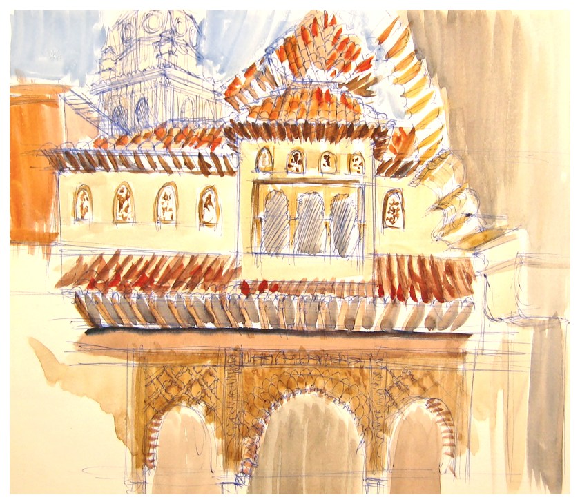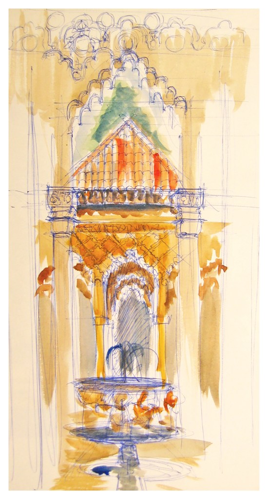 Je terminerai par le portique de la Tour des Dames, dans les jardins du Partal, qui m’a inspirée une version graphique et que mon ami Alain Marc a représenté en aquarelle lors de son passage avec ses stagiaires en mai 2023 (et que j’introduis ici aves son aimable autorisation), suivi d’une de ses vidéos (en cliquant sur le lien).