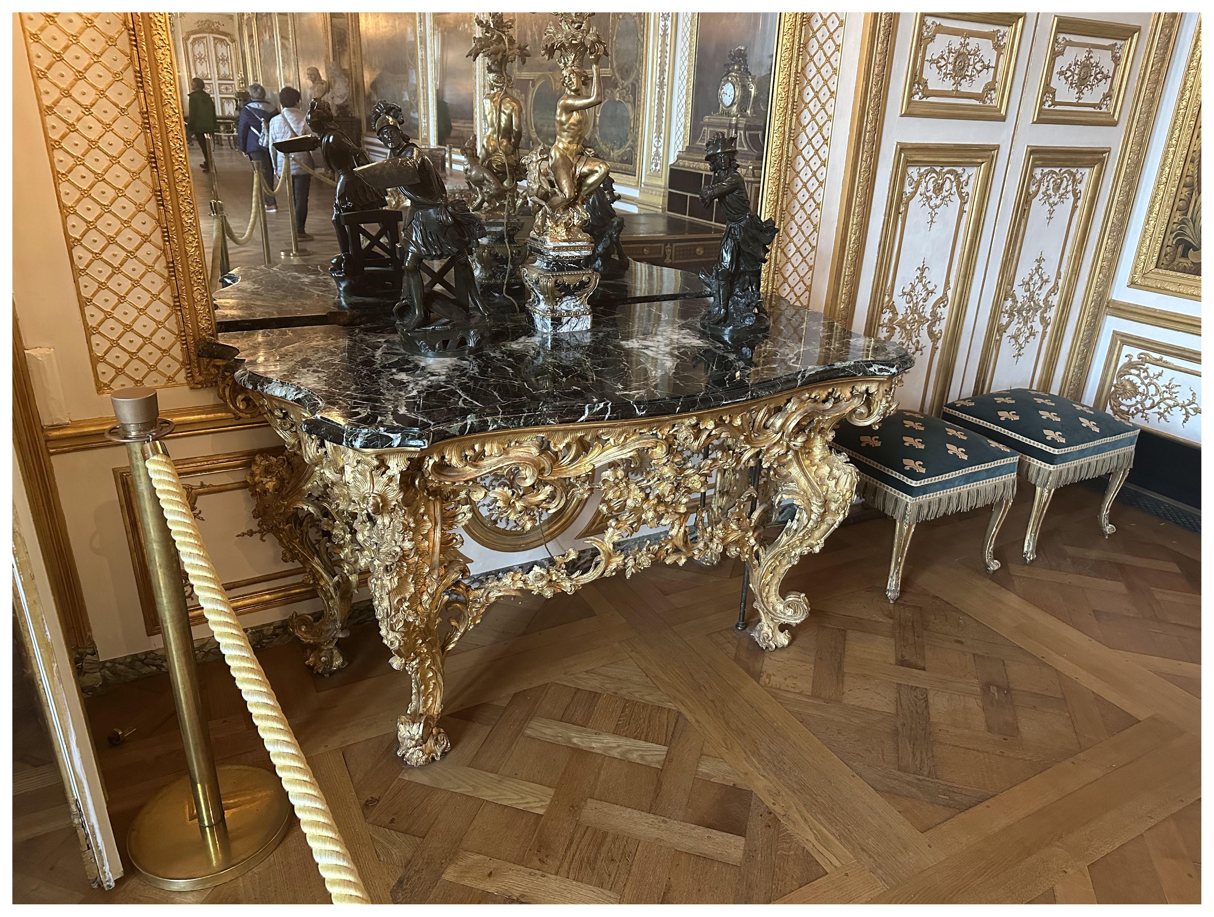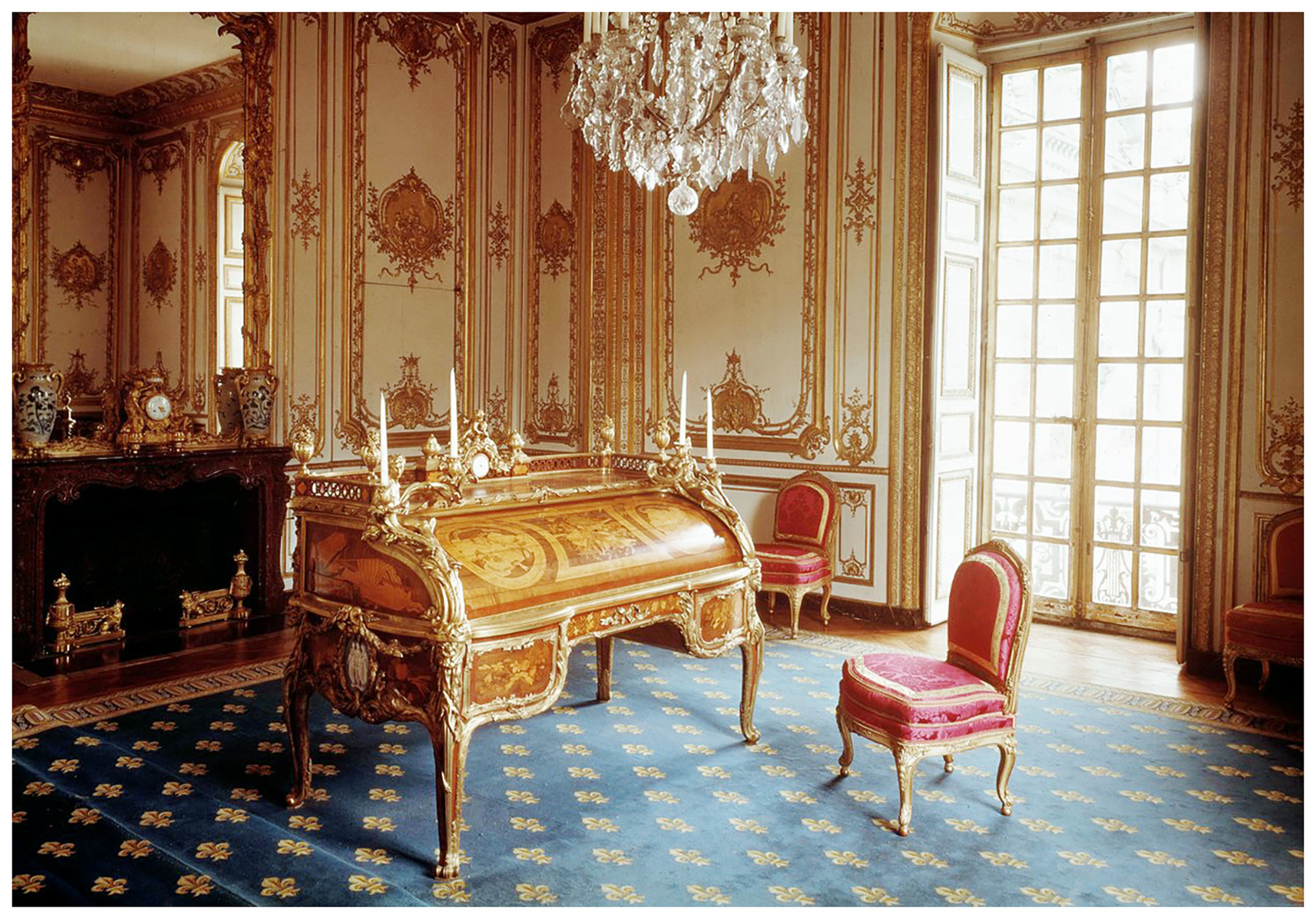 Décoration riche s’inspirant du style Régence (chinoiseries) et de la rocaille, il est à noter une absence de symétrie. Elle sera de nouveau présente dans la transition.