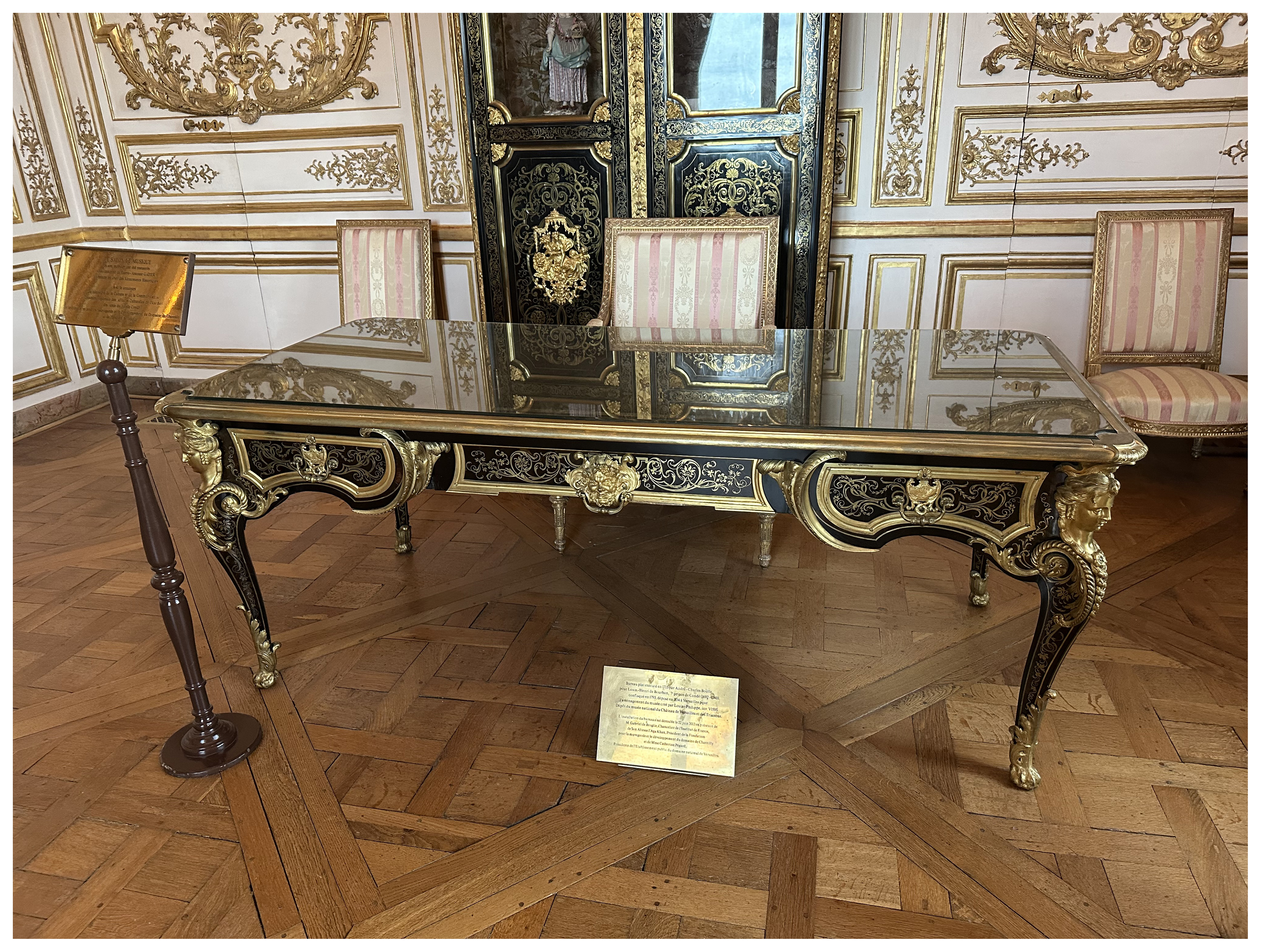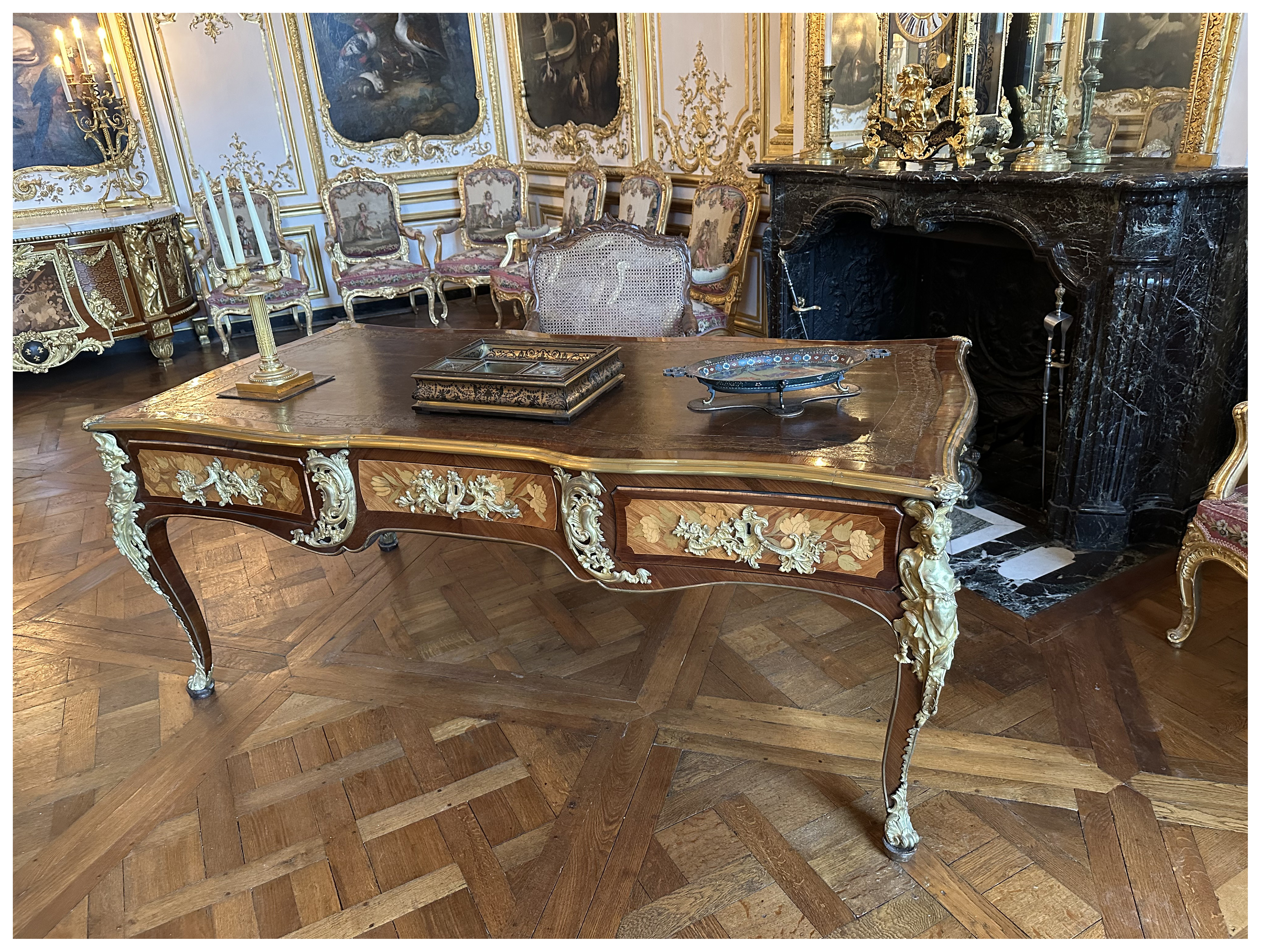 Les bureaux, plats en poirier noirci. Cinq tiroirs à caissons dont un central – quatre pieds galbés terminés en sabot – filets de cuivre – serrures et poignées en bronze doré. Un exemple, un bureau plat exécuté par Boulle en 1715, année de la mort du Roi Louis XIV, et qui fait partie de la nombreuse collection du Duc d’Aumale au château de Chantilly. C’est peut-être une des dernières commandes de l’ébéniste qui a décidé de « passer la main » à ses quatre fils après la disparition du souverain.