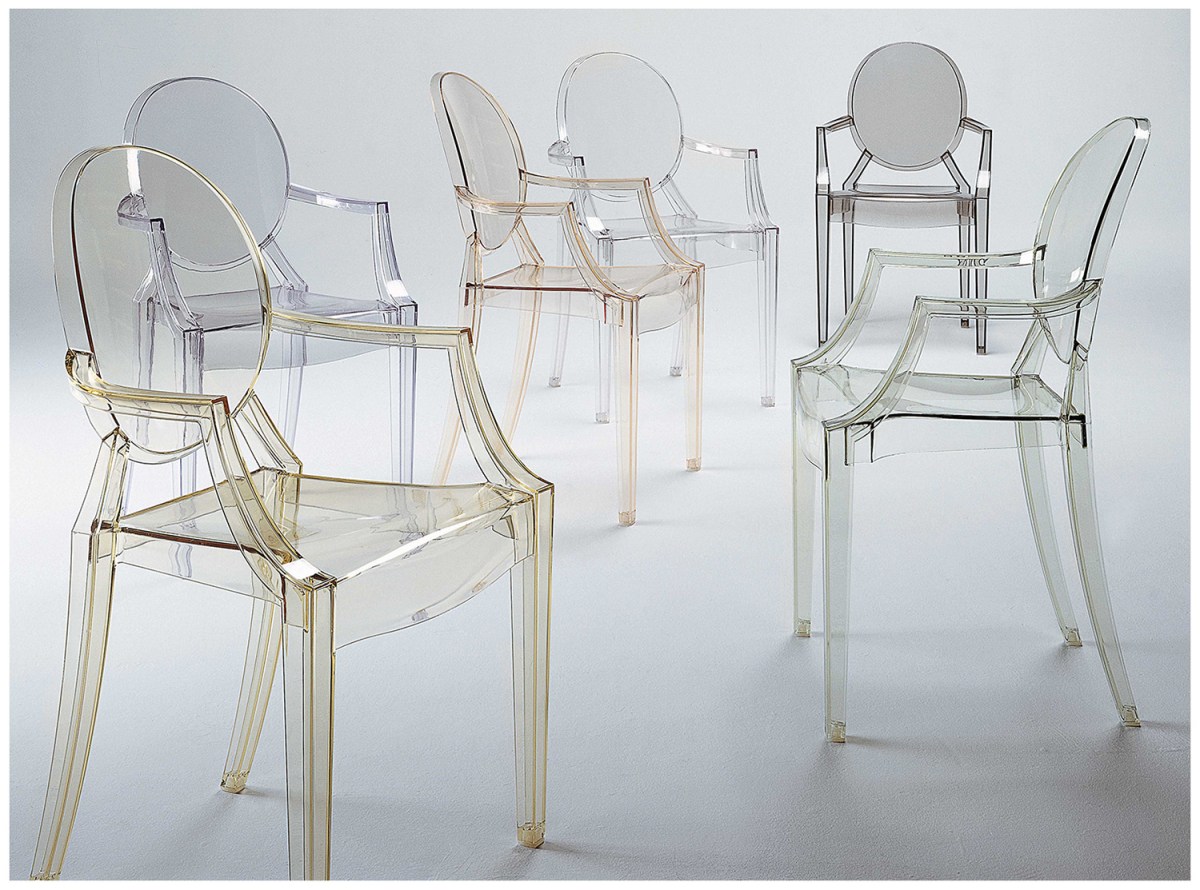 La silhouette d’un fauteuil emprunté à un style du passé, à savoir le style Louis XVI, qui symbolise l’ordre, la rationalité et le pouvoir aristocratique, se voit transposée grâce au choix d’un matériau transparent issu d’une création industrielle mise au point en 1953 par les chercheurs Schnell, Bottenbruch et Krimm.