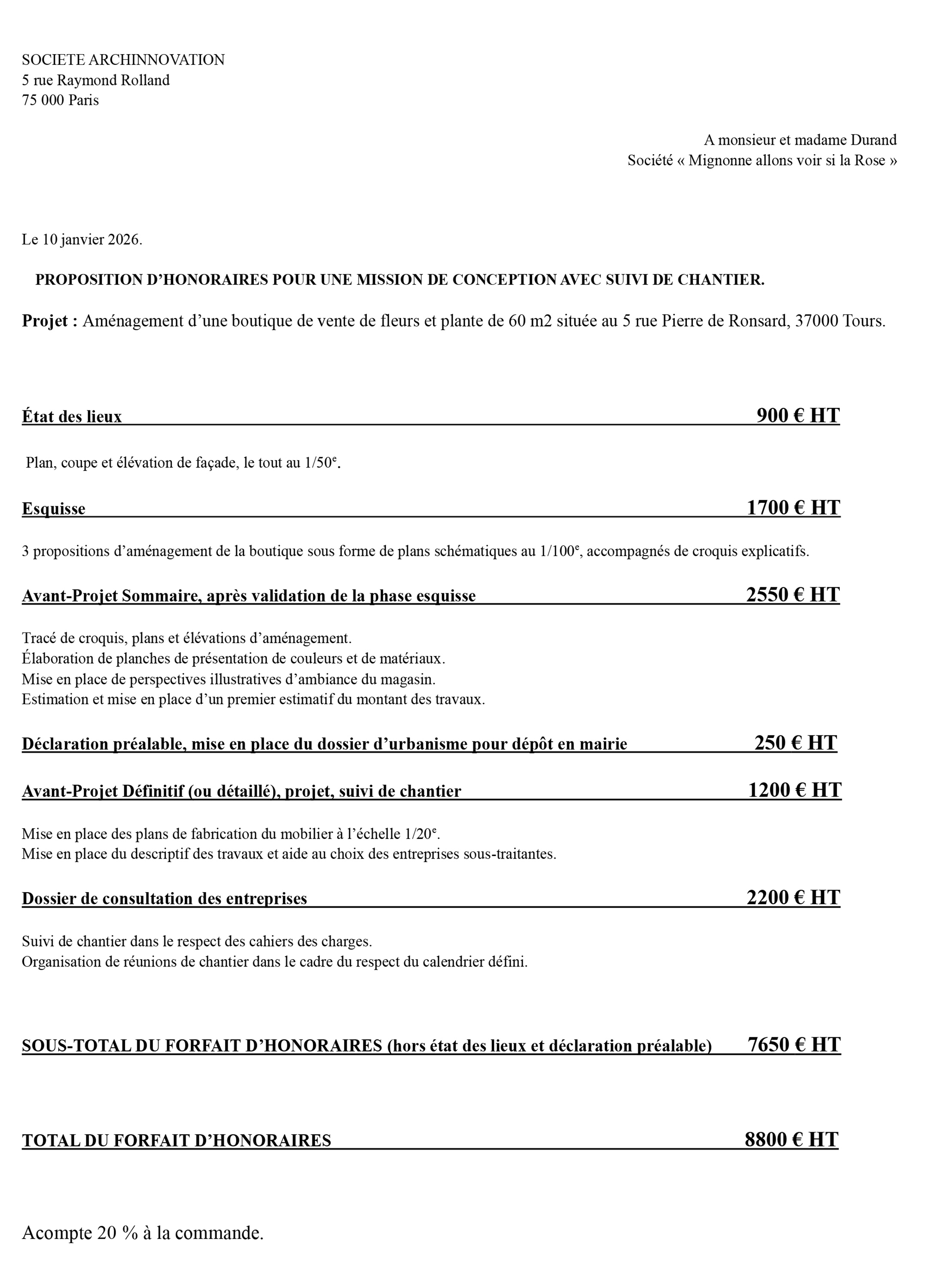 Un forfait de 900 € HT est proposé pour l’élaboration du dossier EDL. Pour le reste, le taux de rémunération habituel pour ce genre de mission des de 9 pour cent, répartis comme suit :