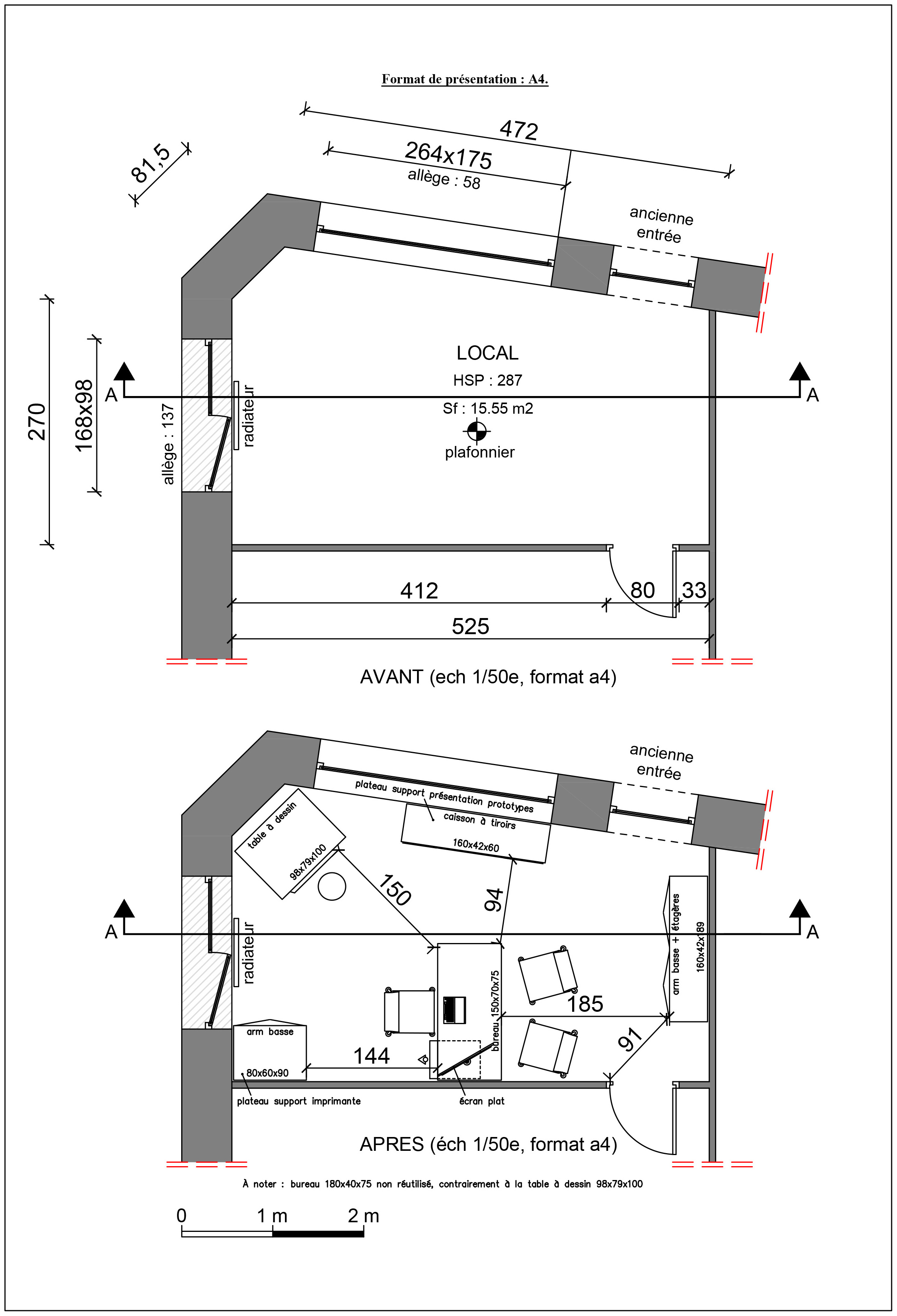 C’est un petit local, sans fenêtre et le battant de la porte dans le sens de l’intérieur de celui-ci va rendre plus difficile encore une implantation de salle de bains avec ce qui est demandé d’aménager. J’ai donc décidé de remplacer la porte battante pleine par une porte coulissante vitrée et placée côté couloir afin de permettre une « respiration spatiale » et d’amener de la lumière naturelle, en partant du principe de la présence d’une fenêtre dans le passage mitoyen. Hauteur sous faux plafond / 2 m 50.
