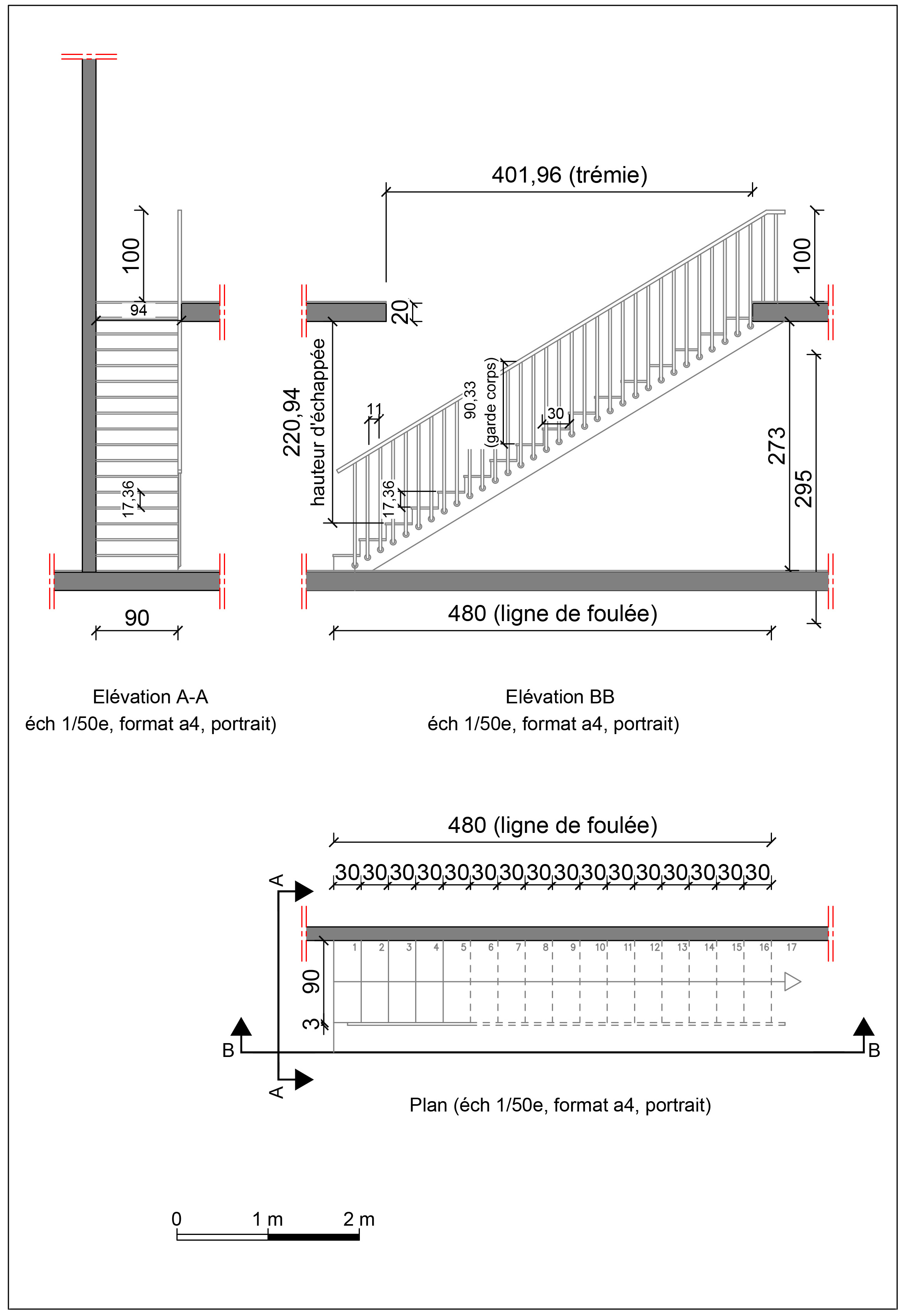 Calculez le nombre de marches, leur hauteur, la dimension de giron que vous préconisez ainsi que la longueur de la ligne de foulée et la largeur de l’escalier. Expliquez vos calculs et précisez les éléments à prendre en compte pour la conception du garde-corps et de l’escalier en général.