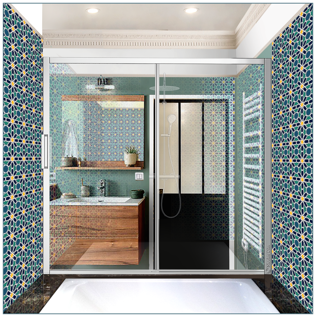 Voicie une vue 3D non contractuelle par rapport au plan, d’une salle de bains d’un appartement haussmannien. Le local est petit, d’où une porte vitrée coulissante au verre sablé pour libérer de l’espace, et des zelliges marocains sur certains murs (montage Photoshop puis optimisation par l’IA). L’usager peut choisir le mode bain ou douche.