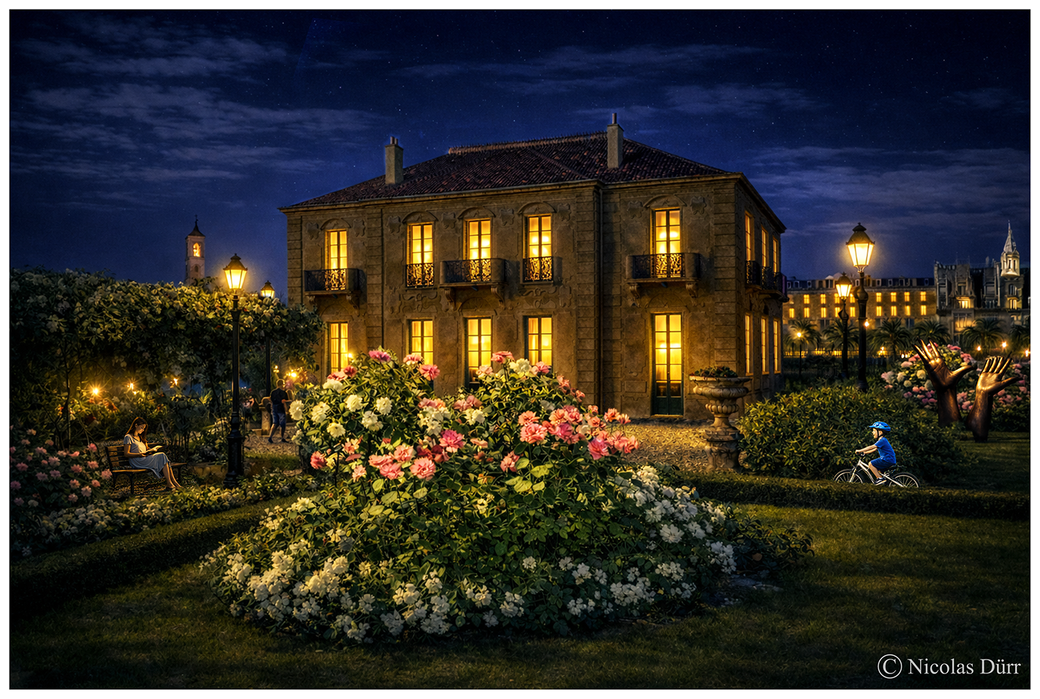 Ambiance calme et détendue par une après-midi ensoleillée. A noter, comme petit « clin d’œil » pour mon ami aquarelliste Alain Marc : la reprise d’une sculpture de mains de feu son père, le peintre, sculpteur, résistant et conteur occitan Jean Marc (Roger Bienvenue Carrière de son vrai nom (18 mai 1924 / 23 mai 2008), que l’on peut découvrir, en réalité, dans un parc à Eragny, dans le département du Val-d’Oise.