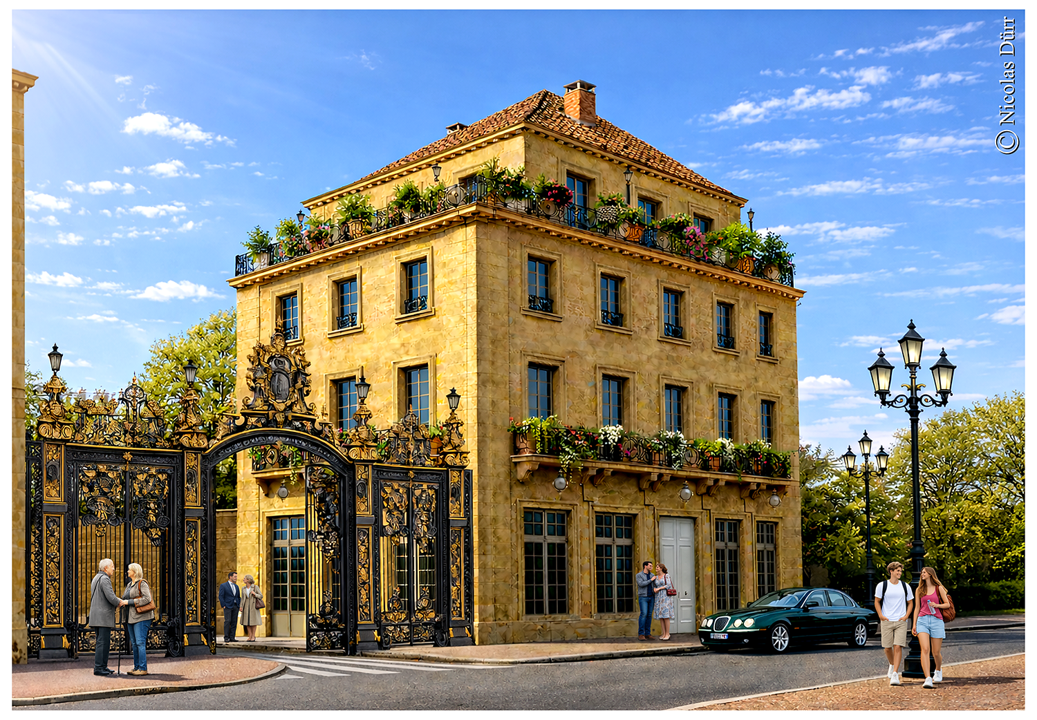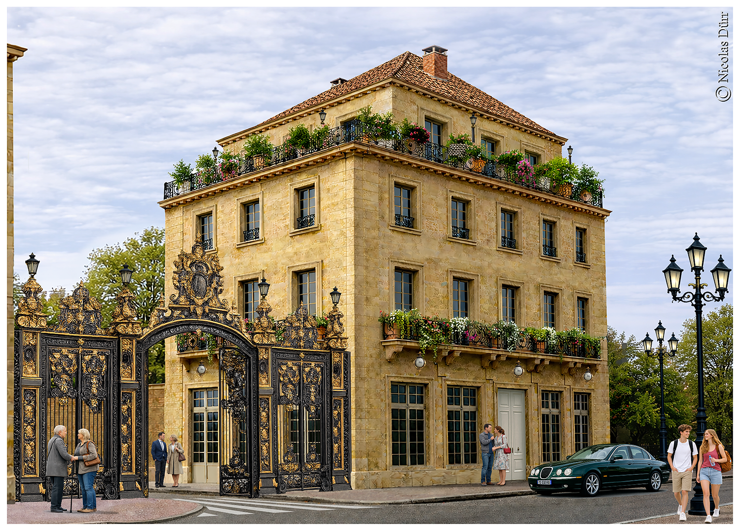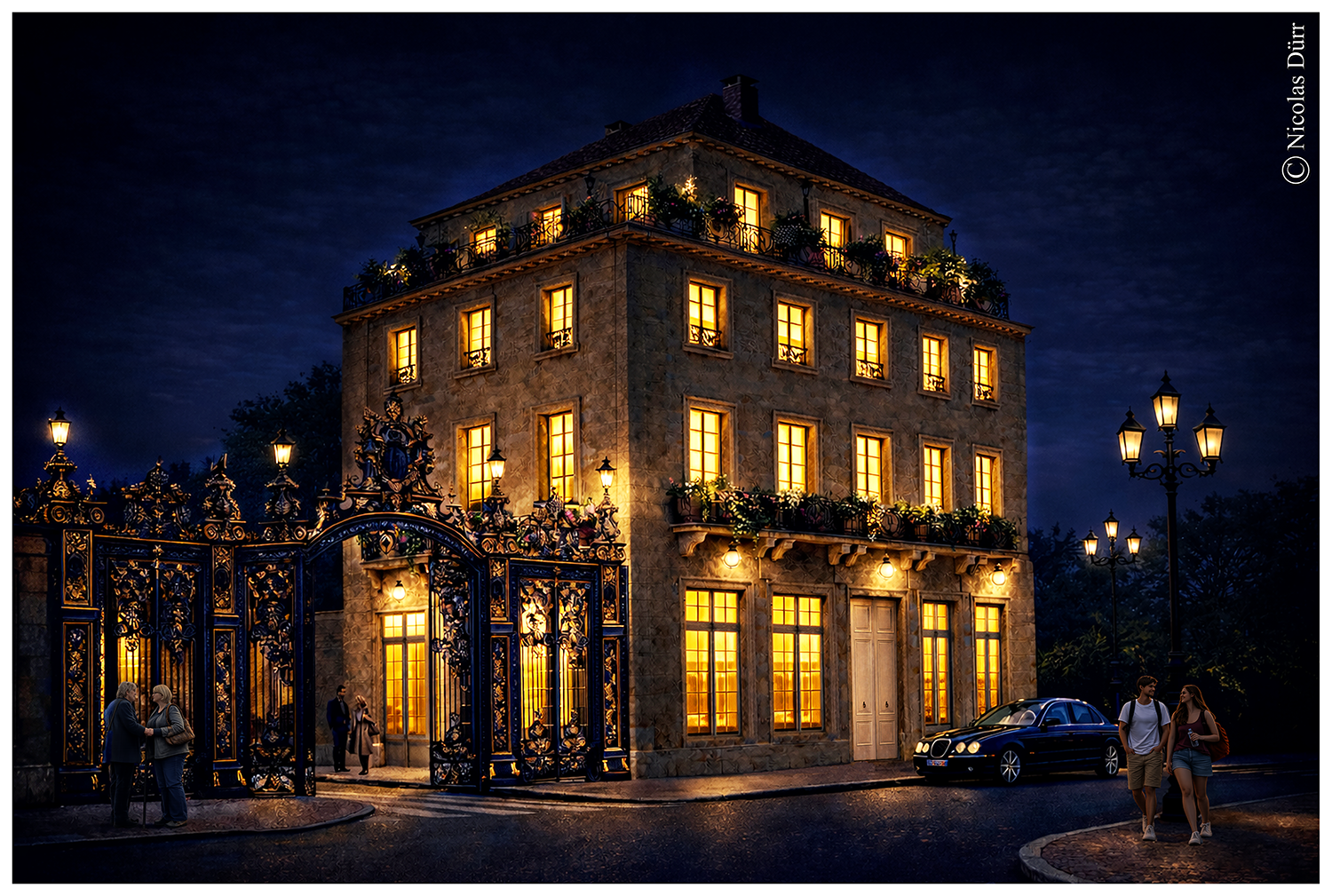 L’usage du logiciel Photoshop combiné à l’IA permet des rendus d’ambiance urbaine sympathiques et je vous présente ci-dessous, deux lieux imaginaires, à commencer par une rue élégante de jour et de nuit.