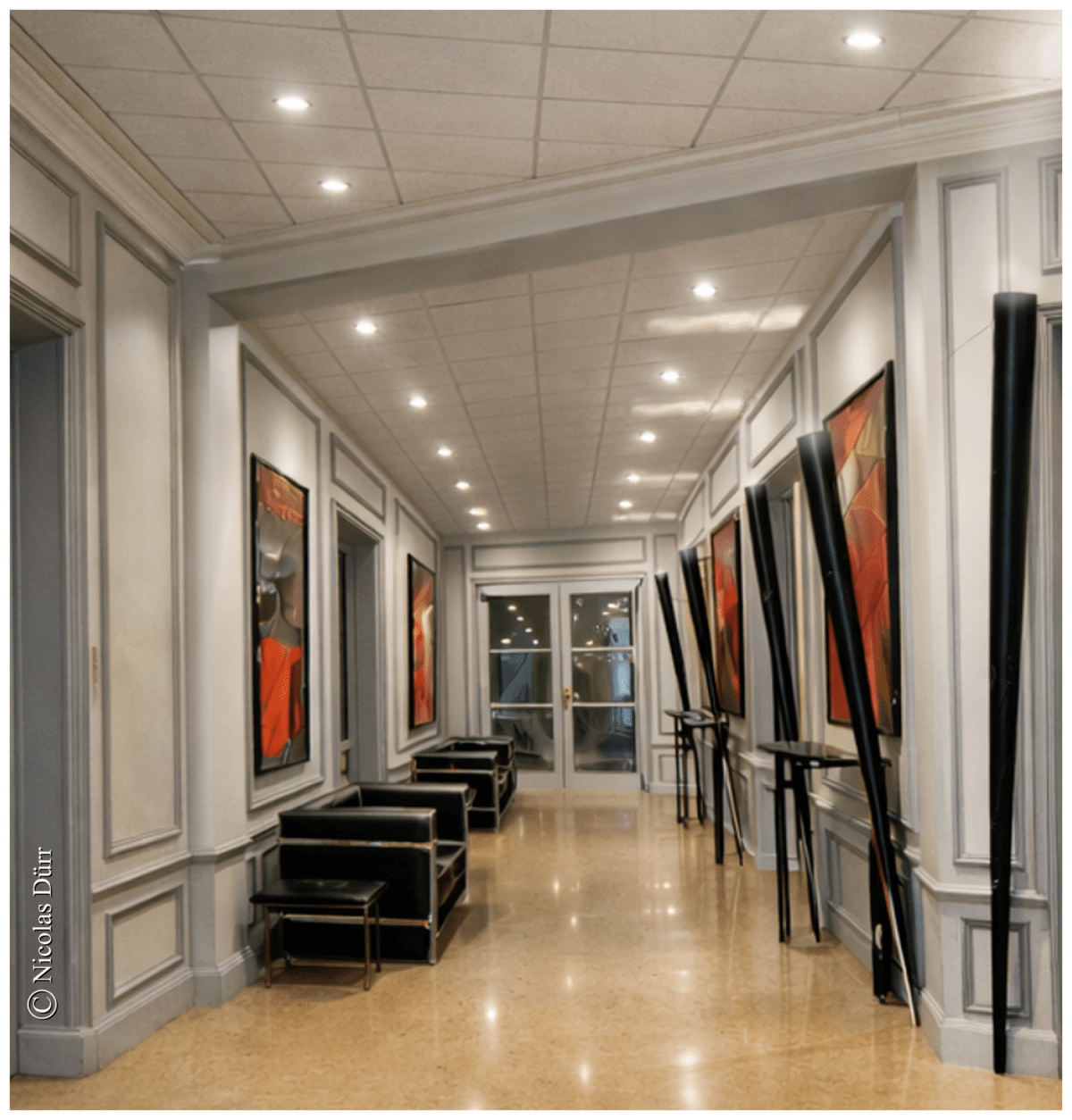 À cette base classique s’ajoute une intervention contemporaine lisible : mobilier design, luminaires graphiques, dispositifs verriers et traitement scénographique de l’art. Ces éléments introduisent contraste, modernité et dynamisme, sans altérer la lisibilité du cadre existant.