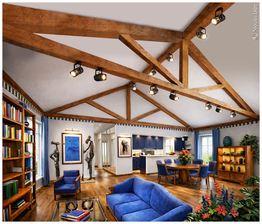 - Les poutres apparentes en bois massif structurent fortement l’espace et donnent un caractère presque chalet / loft.