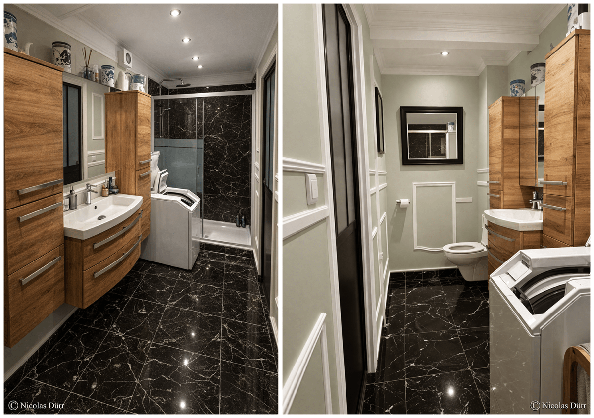 Pour conclure, il s’agit de repenser une salle de bains compacte en y apportant une esthétique d’inspiration chic et contemporaine, avec l’apport de codes classiques (moulures) et modernes par l’ajout de matériaux nobles (marbre noir) et des contrastes forts.