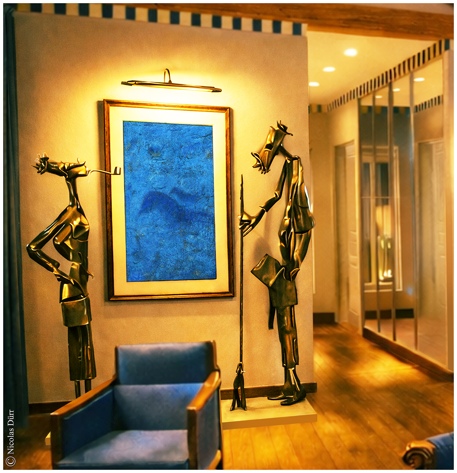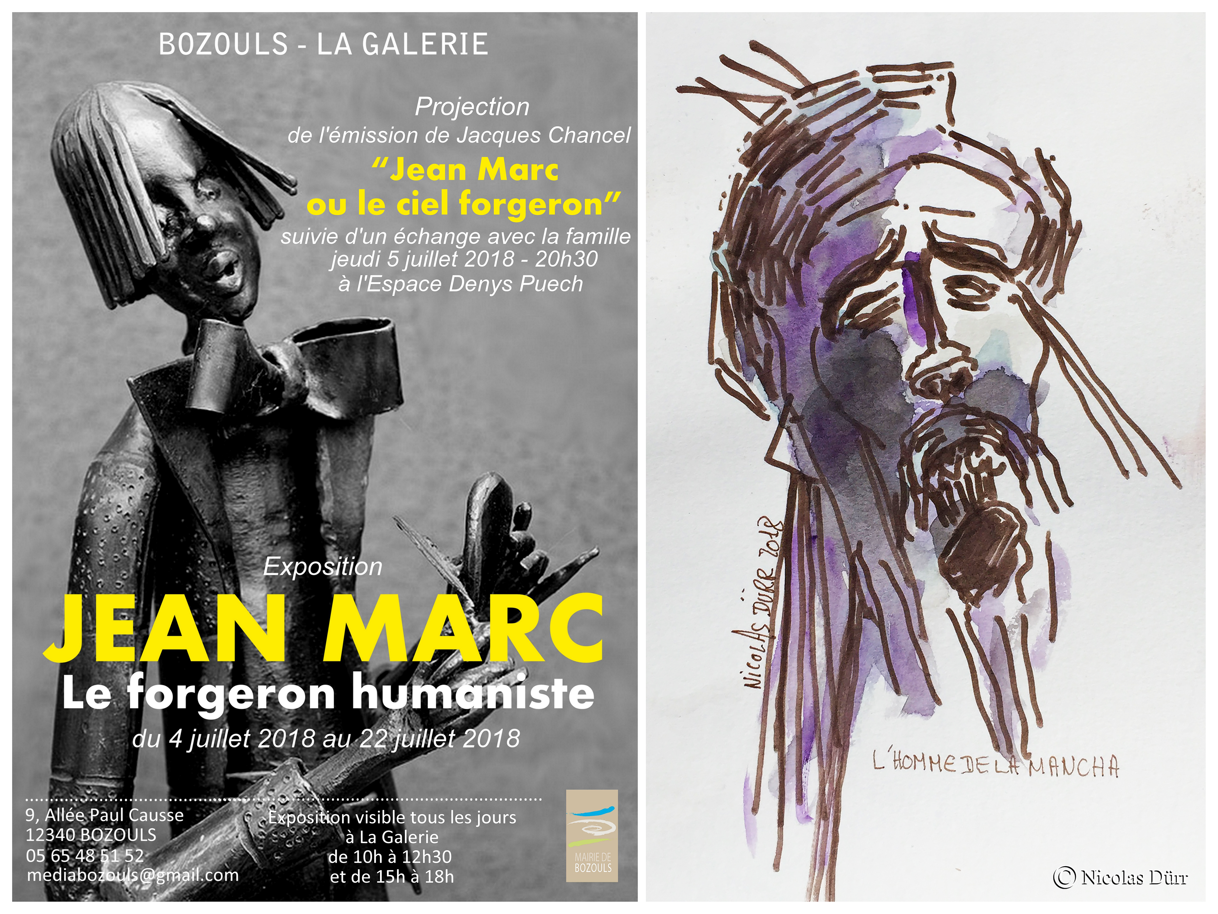 L’ensemble est complété par un de mes dessins aquarellés qui représente une autre sculpture de Jean Marc, « L’Homme de la Mancha », qui a été exposée notamment à Bozouls, dans l’Aveyron, en juillet 2018.