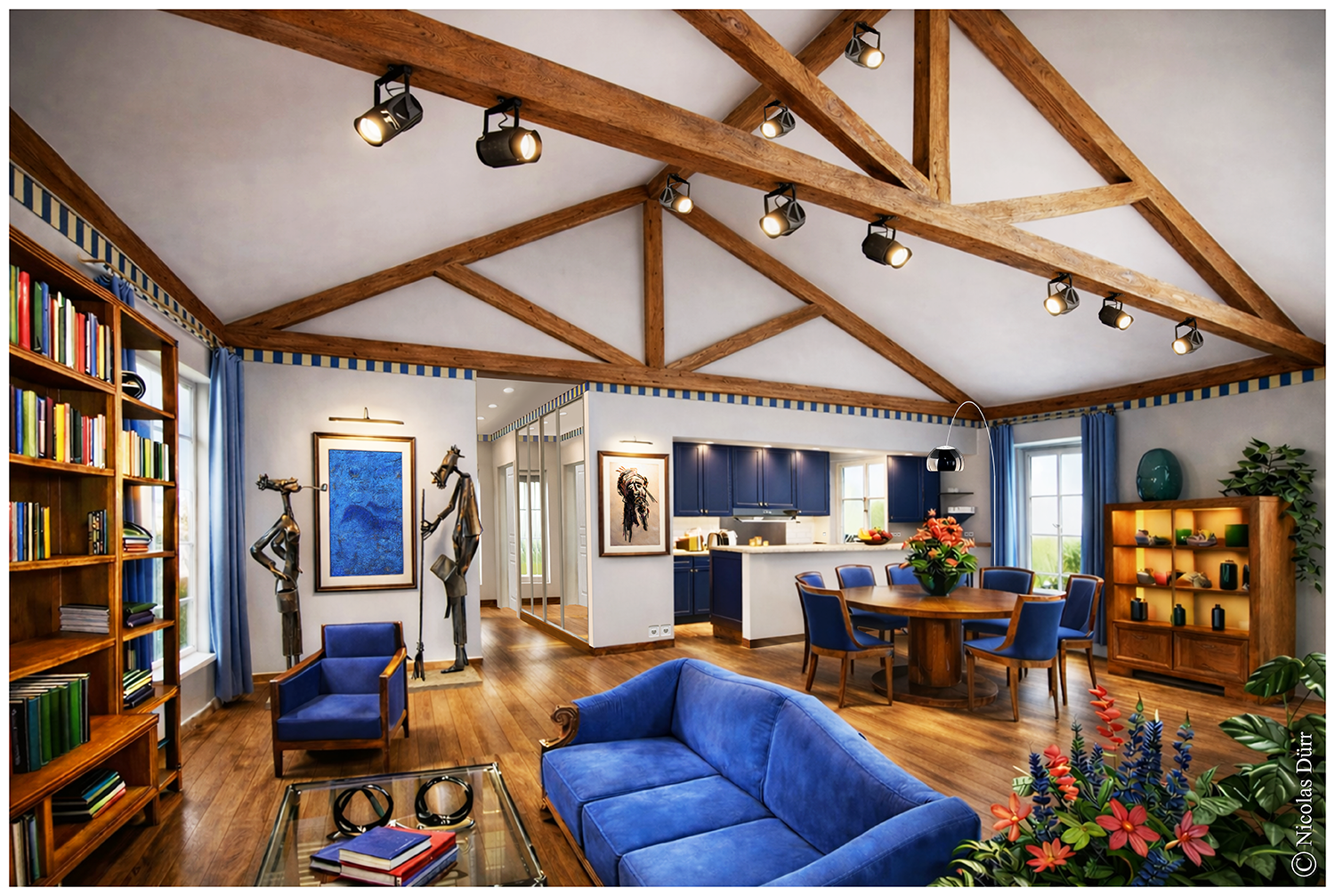 • Le bleu nuit est omniprésent : cuisine, fauteuils, canapé, rideaux, peinture exposée.