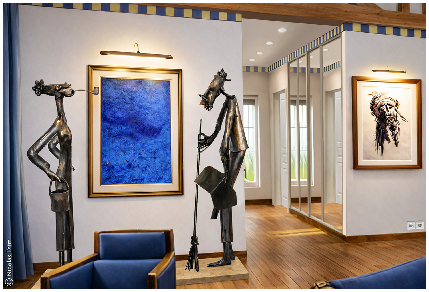 • Présence de sculptures élancées en métal → touche artistique forte, presque galerie.