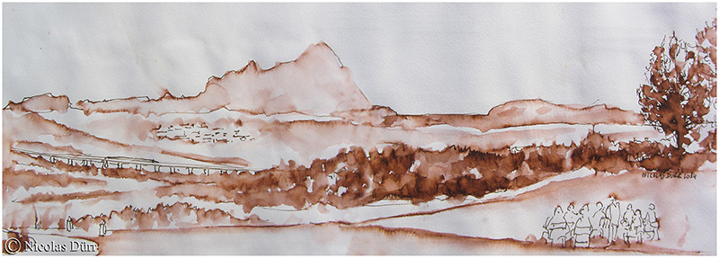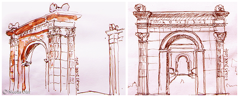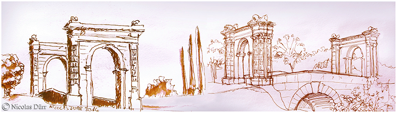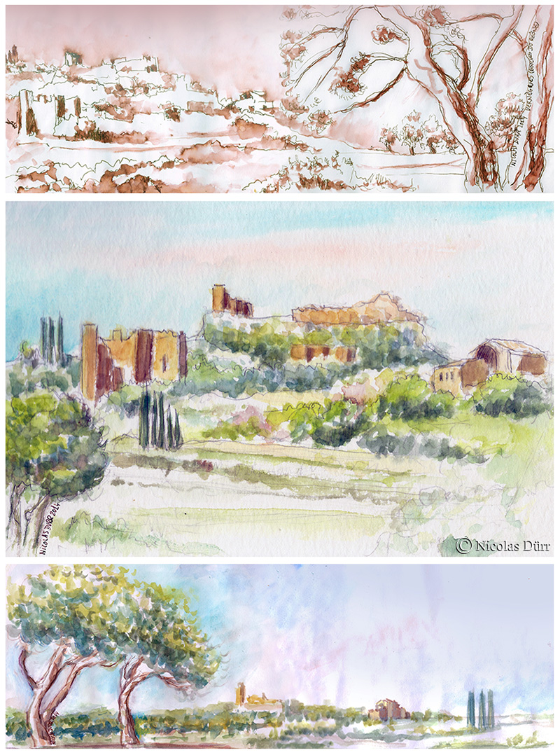 Any stay about watercolours in Provence, goes through the inevitable treatment of the Saint Victoire’s subject. We thus went on the 3rd day morning on the Ventabren heights to paint, on our turn, this mountain which was immortalized by Cézanne. Personnally, I chose the sepia ink diluted with water to paint a watercolour. Below stands the city of Aix-en-Provence , my afternoon destination. I will next go on a site which I particularly appreciate, the Vendôme Pavillon.