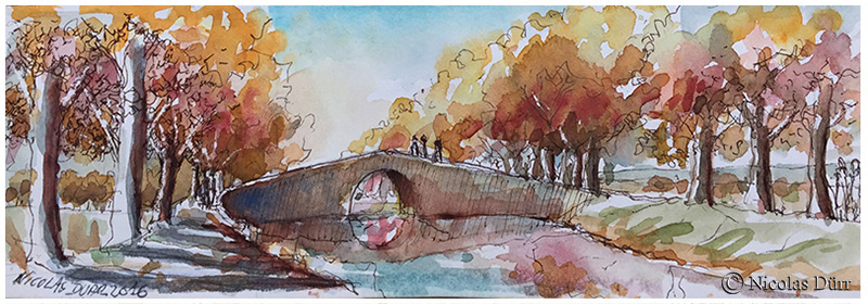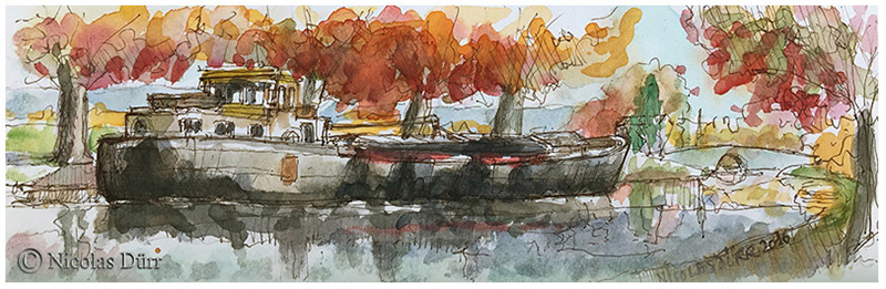 Nicolas : Dès 16 ans, j’ai été séduit par la richesse végétale et architecturale du canal du Midi. L’envie de le longer me travaillait depuis que mon père m‘avait parlé de son propre désir de le parcourir, ce qu’il n’a pas pris le temps de le faire. Comme il vient de disparaître, j’ai accompli notre rêve à vélo, un peu à la façon d’un hommage. Cette découverte du canal a aussi renforcé mes passions : la photographie, le dessin et l’aquarelle.