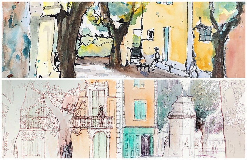 Le récit, par Nicolas globe croqueur, de deux sorties urban sketchers à Sauve, dans le Gard, les 20 et 27 août 2020.