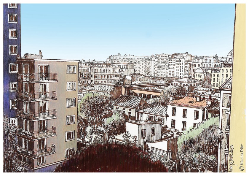 Le confinement aura été l’occasion également de relever des défis graphiques divers et variés comme aller dessiner cette vue de Montrouge (Hauts-de-Seine) que je voyais d’une de mes fenêtres…