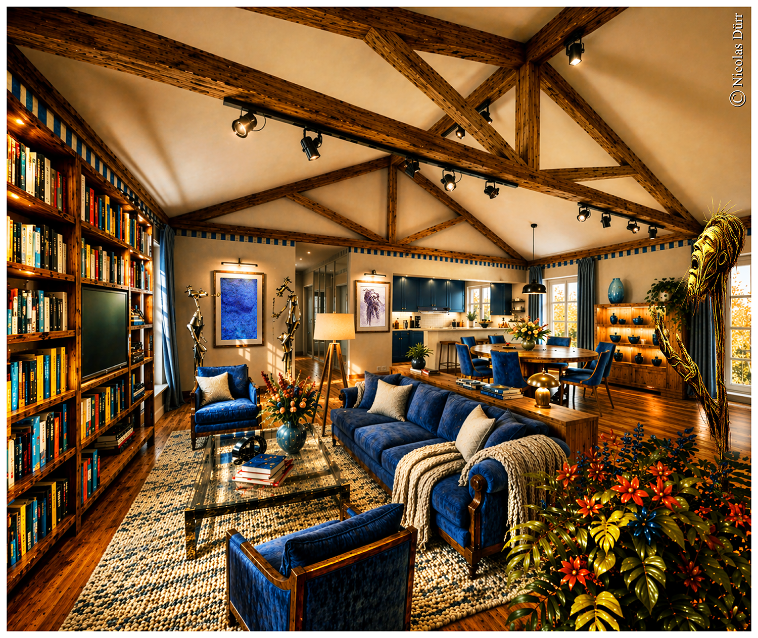 Le visuel ci-dessous présente un aménagement plus enrichi, même si certain(e)s pourraient le trouver un peu trop chargé. A droite, la sculpture « L’homme de la Mancha » de l’artiste cité en début de cette publication.