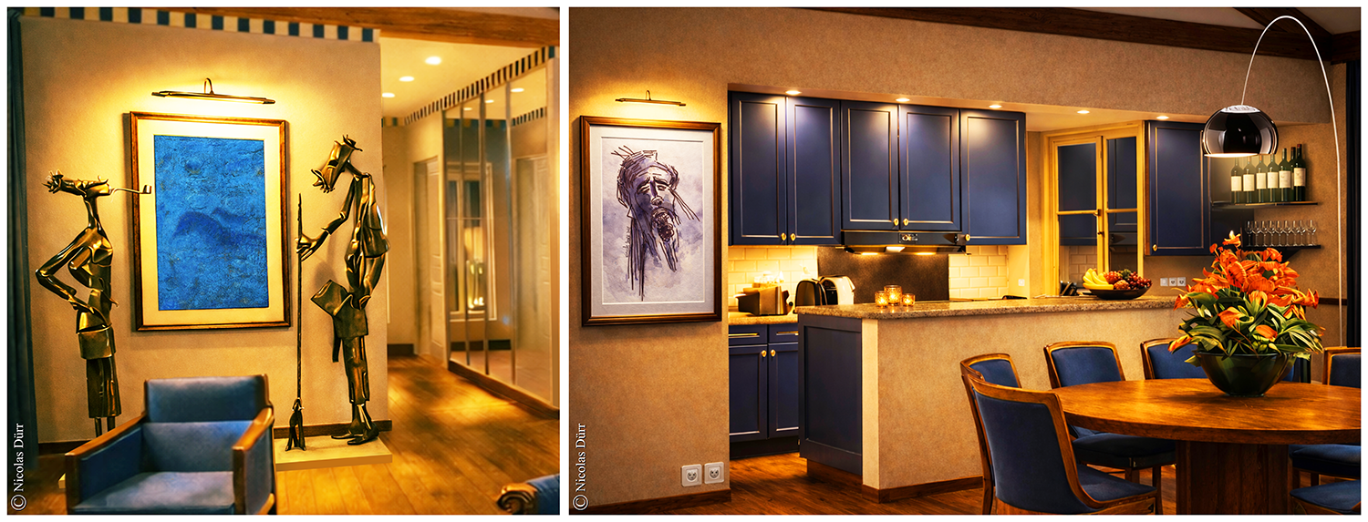 L’appartement n’est pas seulement décoré, il est mis en scène comme un espace d’exposition habité, par la présence de sculptures métalliques élancées et des tableaux encadrés avec éclairage dédié qui mettent en scène les murs. La sobriété du mobilier laisse ainsi l’art s’exprimer.
