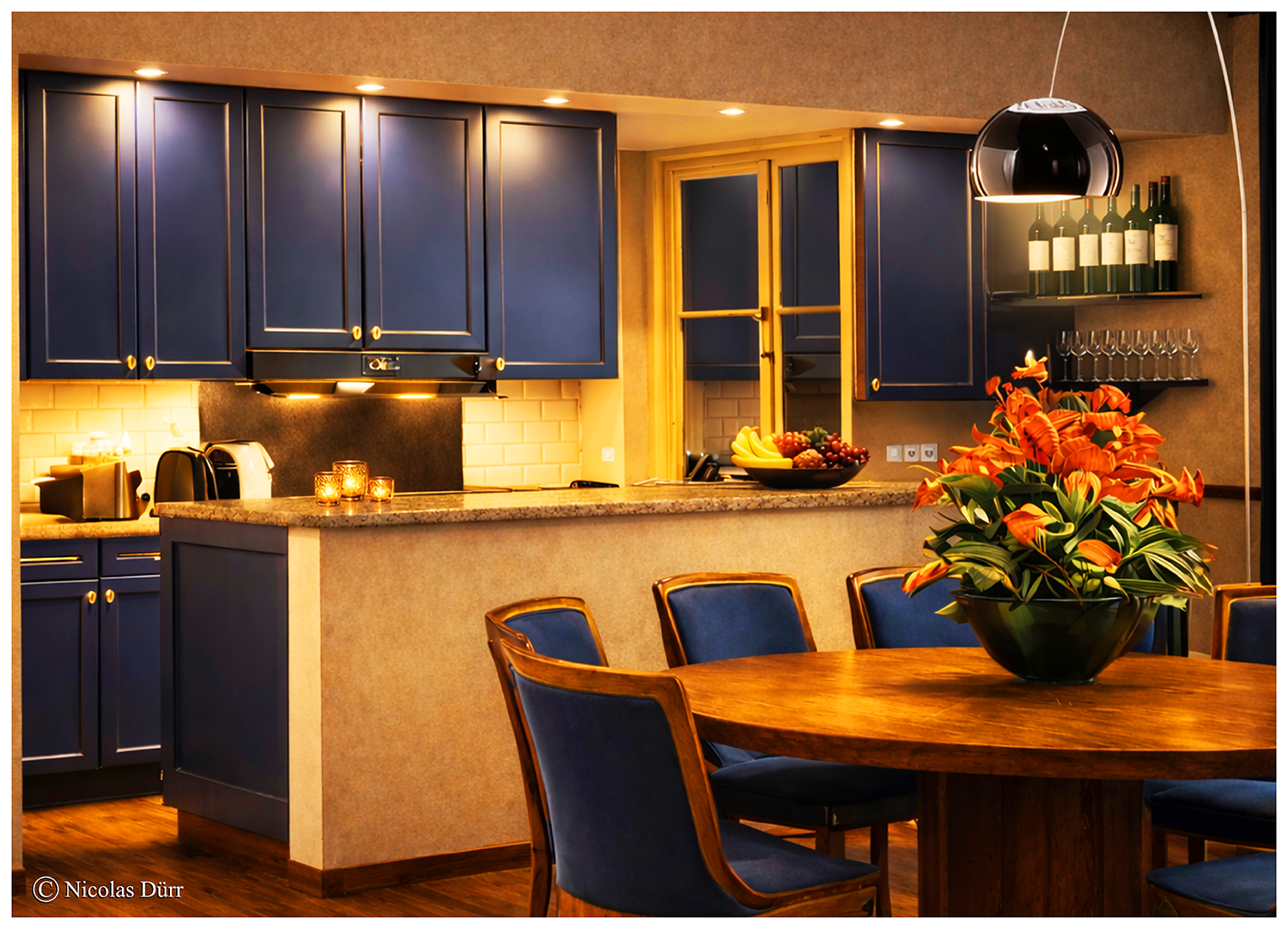 La cuisine ouverte n’est pas seulement un simple espace fonctionnel, mais s’intègre comme un élément apportant une plus value à l’esthétique du séjour. Pensée comme un meuble décoratif, elle participe pleinement à la décoration globale. Les façades bleu profond apportent un caractère élégant et sophistiqué et les finitions (poignées discrètes, lignes épurées) renforcent un effet quasi mobilier. Ainsi, la cuisine ne “crie” pas sa fonction mais se fond harmonieusement dans l’ambiance du salon.