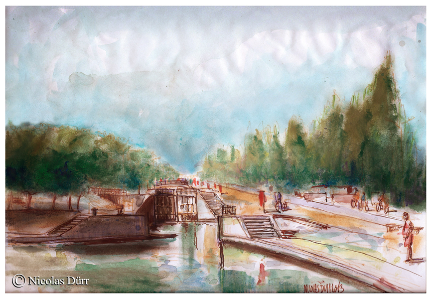 En guise d’introduction, je vous partage deux pièce graphiques, d’une vue en aval à partir du septième bassin, peintes lors d’un passage en été pour la première (retouchée numériquement, par la suite) et en hiver pour la seconde.