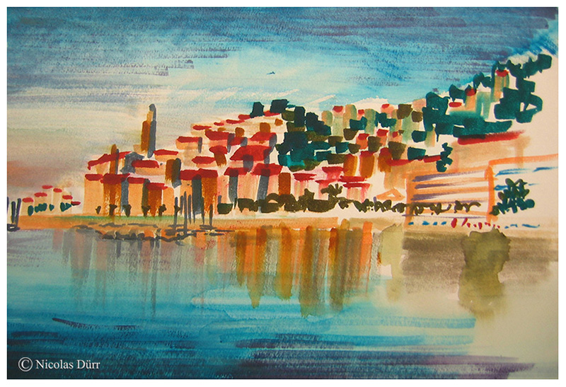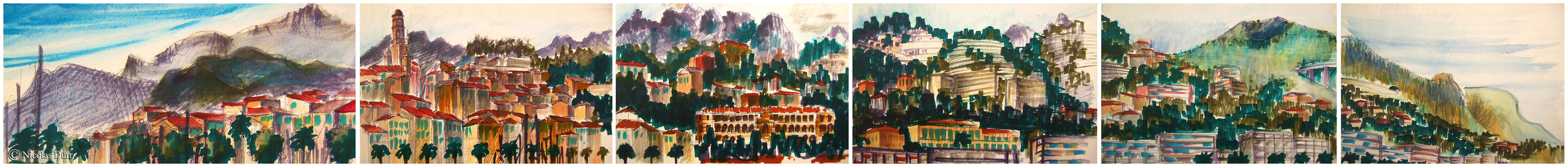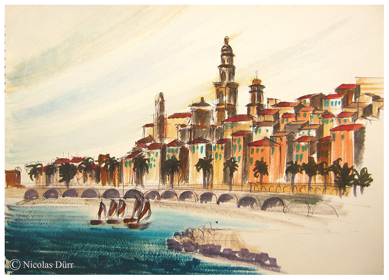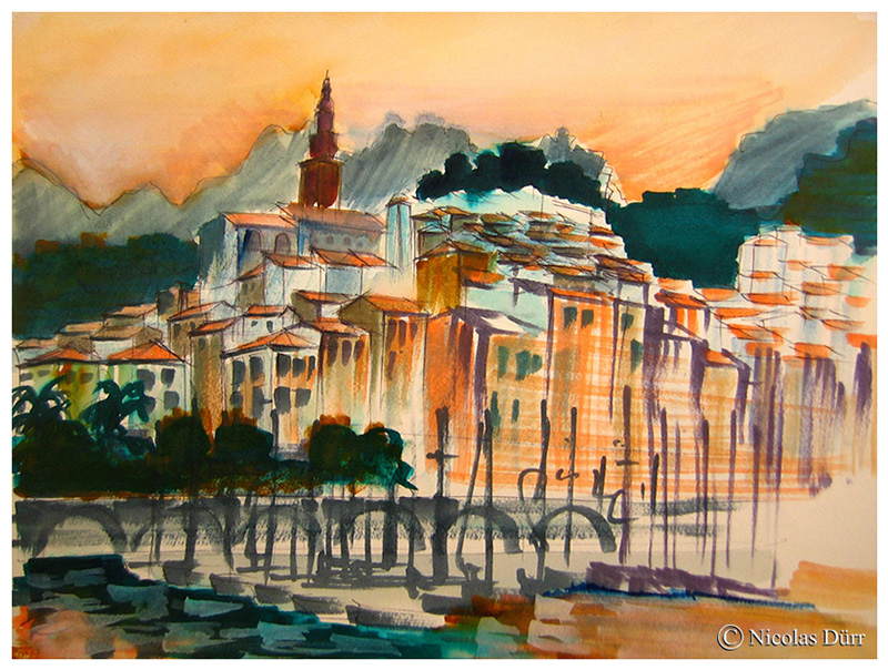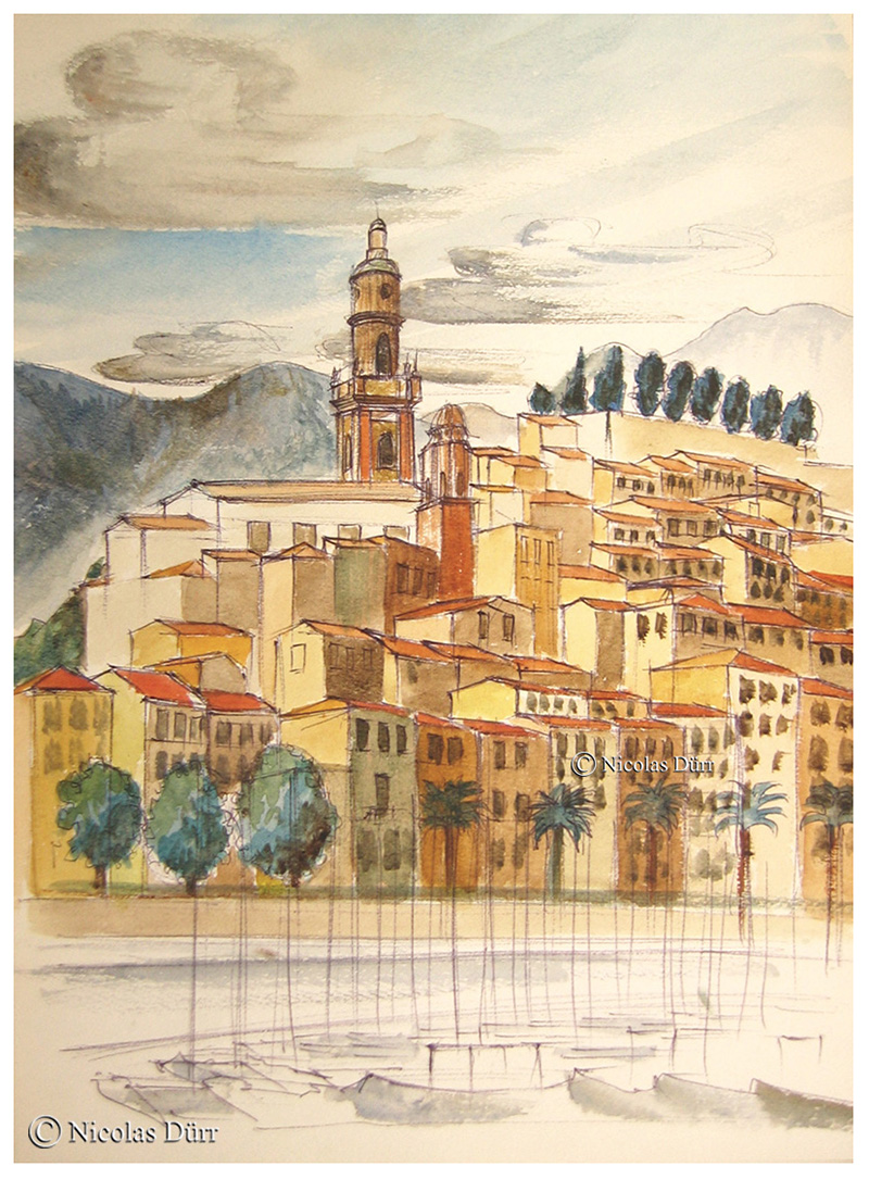 En consultant mes archives graphiques que je prend soin de numériser, j’ai retrouvé mes travaux d’étudiant sur Menton. Je vous les fait partager. Voici donc cette ville frontalière dessinée et peinte à différents moments de la journée, de l’aube à la nuit tombée.