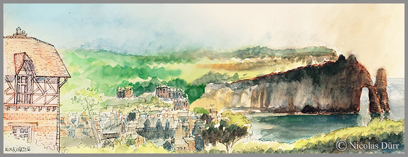 Et c’est sur cette aquarelle des toitures d’Etretat que je termine ce récit.