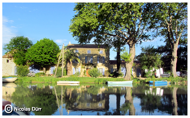 … alors que, sur la rive droite, le gîte « Le Bosquet du Somail » , bâtiment aux façades ocre, marque l’entrée du Canal sur Sallèles d’Aude et le Narbonnais.