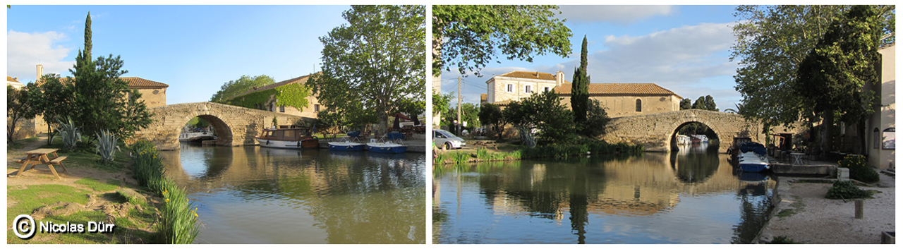 Je prend soin de traverser le pont de manière à découvrir le Canal, direction Carcassonne avec la péniche épicerie à droite, et le Canal, direction Béziers, avec un service d’excursion qui mène les touristes jusqu’au Canal de Jonction de La Robine et l’écluse de Cesse.